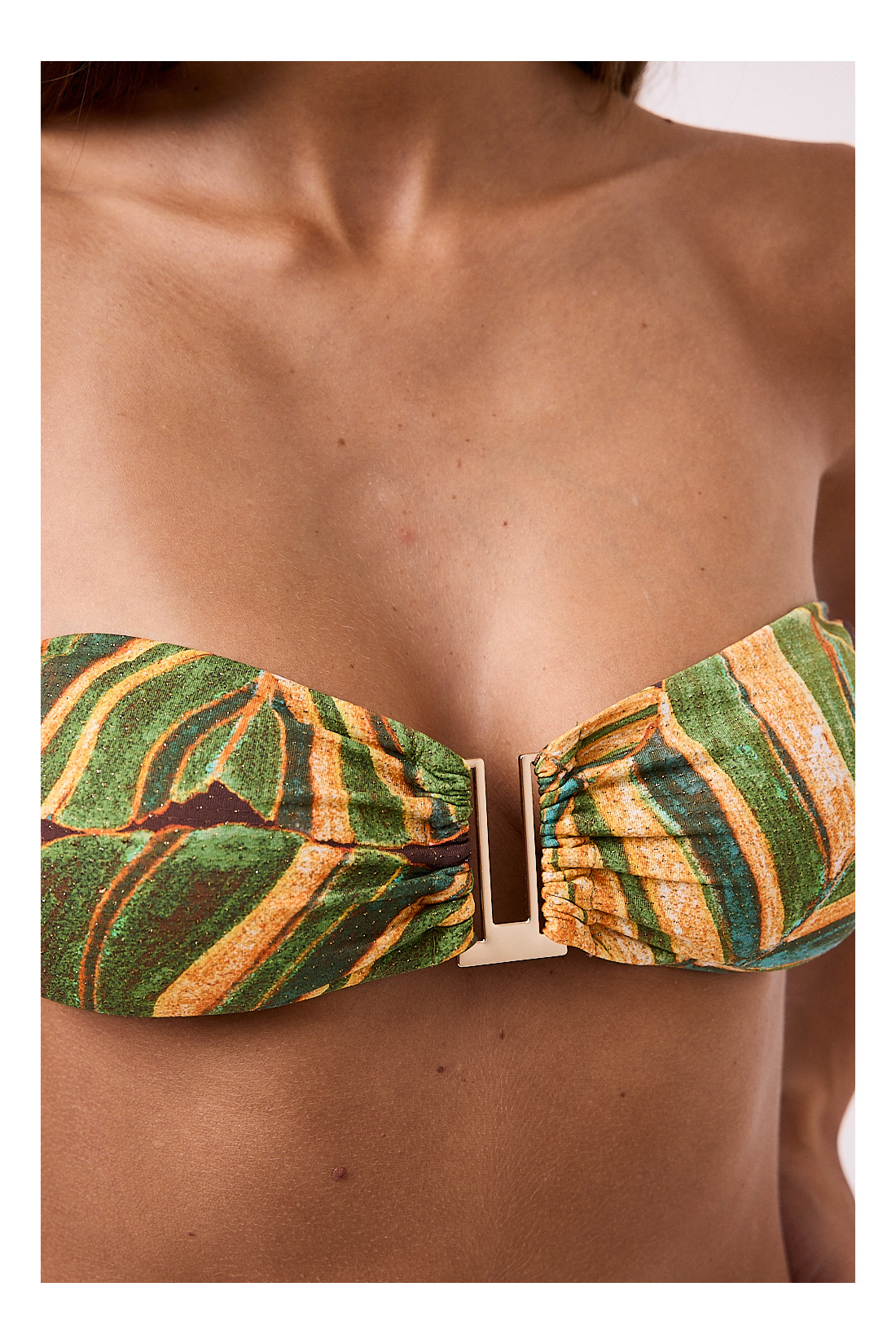 - bikini a fascia in lycra base stampa nei toni del verde, accessorio dorato nel centralino nickel-free;